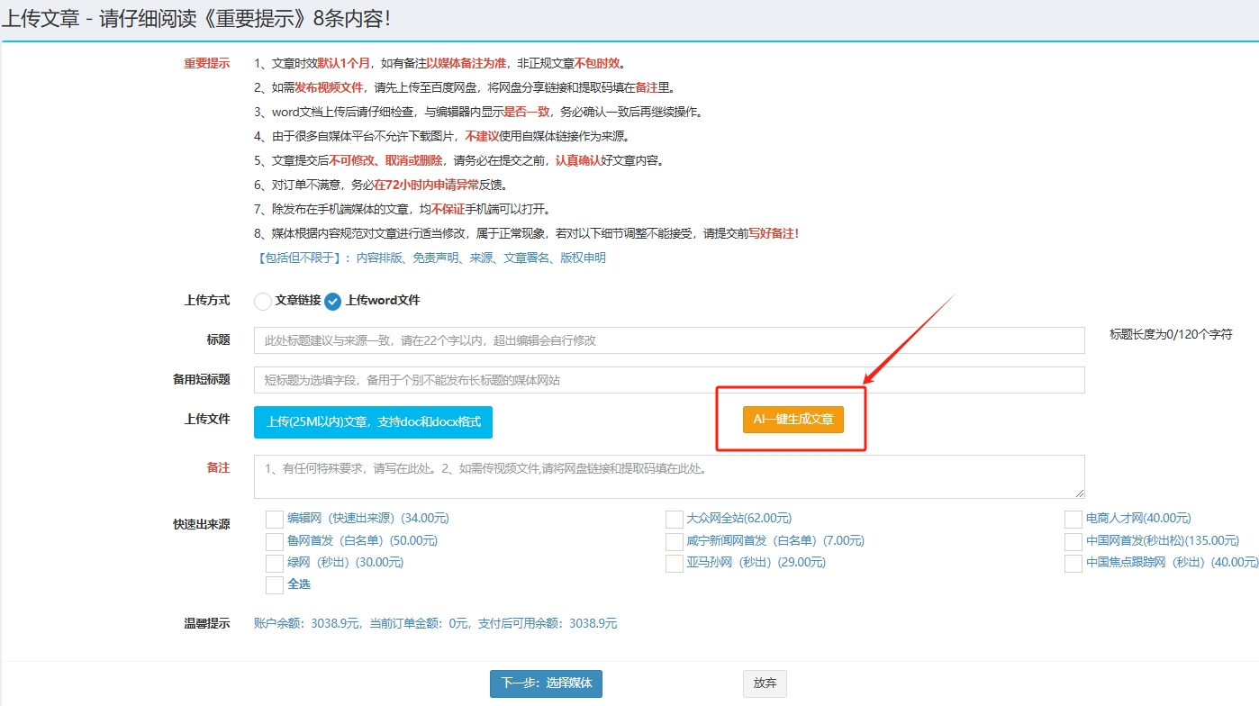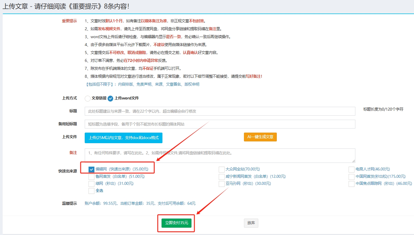 進(jìn)入【上傳文章】頁面,傳好文章后,勾選【編輯網(wǎng)(快速出來源)】,立即支付即可!