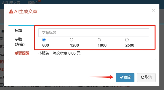 填好需要的標(biāo)題,選好字?jǐn)?shù)范圍,點(diǎn)擊【確定】,耐心等待文章生成。