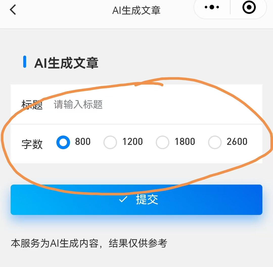 進(jìn)入小程序首頁,點(diǎn)擊【AI生成文章】按鈕,輸入標(biāo)題和字?jǐn)?shù),提交即可。
