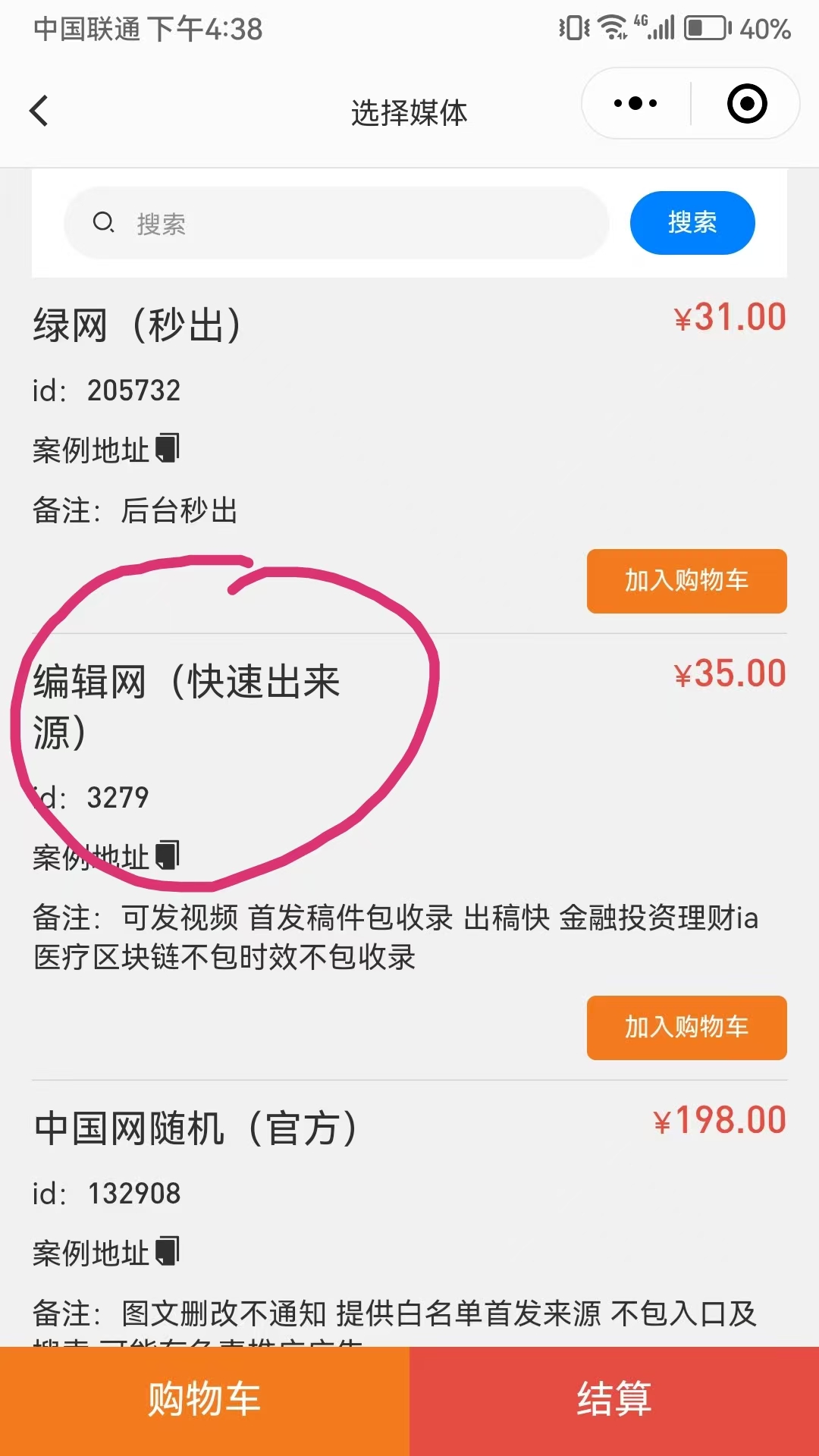 進(jìn)入小程序首頁,傳好文章后,進(jìn)入【選擇媒體】頁面,將【編輯網(wǎng)(快速出來源)】加入購物車,結(jié)算即可!
